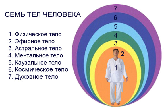 Человек, подобно матрёшке (которая и символизирует это) представляет собой семь тел, где тело физическое является как-бы косточкой внутри всё более тонких (менее плотных) тел — «коконов».