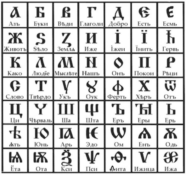 Если говорить о цифрах — в алфавите букве Аз соответствует число 1. Веди — 2. Глаголи — 3. Добро — 4. Есть — 5. Зъло — 6. Z — 7. Иже — 8. Ижеи — 10. Како — 20. Людie — 30. Мыслитъ — 40. Нашъ — 50. И т. д.