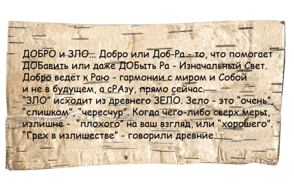 Слово ЗЛО, согласно матрицы-алфавита Sъло (слишком) — Люди — Онъ (некто, нечто). Люди делают нечто чрезмерное, слишком. Древние говорили: «Грех в излишестве». И действительно, с точки зрения китайской медицины, здоровье — это гармония между инь и ян. Как только гармония нарушается, какой-либо из энергий становится больше, возникает болезнь. Принцип весьма эффективной китайской медицины бу-сё означает добавить-убрать. Целитель убирает излишек одной энергии и добавляет той, которой не достаёт. Во вселенском масштабе (начиная с самого малого атома) это делает Дух (добро в гармонии).