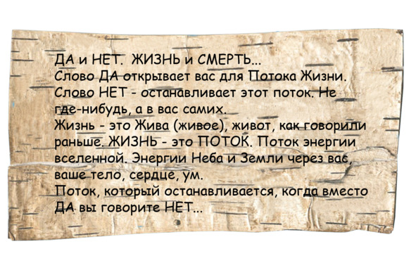ЖИЗНЬ, ЖИВА — Животъ-Иже-Веди-Аз. Жизнь — это поток энергии во всём нашем существе и в теле. Каждое мгновение в нас входит энергия Веселенной, разделённая на энергии Неба (Отца-Неба) и Земли (Земли-Матушки). Китайцы называют эти энергии ян и инь. Вся наша жизнь — это сотрудничество (и даже борьба) во вселенной и в нас этих энергий. Вся жизнь Вселенной и наша жизнь, наши мысли, слова, дела, отношения с другими людьми — движение этой энергии. В нашем общении с природой и другими людьми мы пребываем в потоке энергии, получаем и отдаём её. Мы можем заметить, что с кем-то нам хорошо (поток течёт легко и гармонично), а с кем-то трудно (поток блокируется). Конечно, это зависит и от других, но поток энергии в нас можем заблокировать только мы. Никто другой не может остановить поток нашей энергии, если мы говорим ДА. И останавливаем поток энергии в нас только мы. Мы можем говорить НЕТ, даже если находимся в прекрасных, на взгляд других людей, условиях. На природе, на пляже, в горах. Нам может не нравиться даже прекрасная музыка или пейзаж. Если они не соответствуют нашим привычкам и ожиданиям.