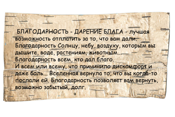 Поскольку через внимание мы соединяемся с тем, что (кого) благодарим, мы открываемся потоку энергии к себе. Благодаря предков — обретаем силу Рода. Через благодарность воде — силу Воды. Земле — Земли. Земля — часть Солнечной системы. Та — галактики. Галактика — вселенной…