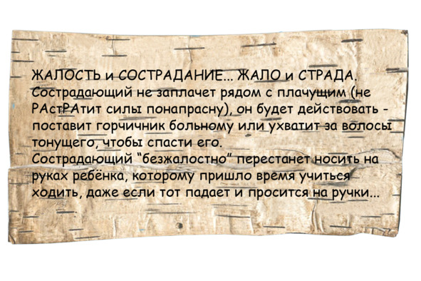 Слово СОСТРАДАНИЕ — это Со-страдание. СОединение, создание Сообщества с тем, кто страдает. Причём не пассивного, где ни у кого нет Силы изменить ситуацию, а активного, деятельного. В слове СТРАДАние явно слышится — СТРАДА. Слово-Твёрдо-Ръцы-Аз-Добро-Аз. Слово, твёрдо речённое духом, добро несущим. Добро — добыча (или добавление) РА (вселенской Силы). Той самой Силы, которую отнимает жалость. Сострадающий всегда способен помочь тому, кто пытается изменить ситуацию. Но он не берёт на себя его ответственность. Это проявлялось и в подходе древних целителей, которые помогали только тогда и до тех пор, пока человек не обретал возможность преодолеть проблему сам. Целитель помогал в критической ситуации, затем давал совет как человеку восстанавливать далее своё здоровье или освобождаться от сложности самому. Как разумные родители не кормят с ложечки и не носят ребёнка на руках бесконечно. Дух — добро в знании гармонии. Есть время, когда ребёнок (или больной) не может что-то делать сам — тогда ему нужна помощь. Но как только наступает момент, когда он может справиться самостоятельно, нужно предоставить ему свободу. Дать ему свободу и возможность эволюции. Эволюция возможна лишь через преодоление трудностей. Тот, кто желает быть здоровым должен давать организму нагрузку. Закаляться, двигаться, заниматься практиками, питанием (или голоданием). Тот, кто хочет быть сильным — должен тренировать, нагружать тело. Кто желает быть умным — должен тренировать ум. Кто хочет пребывать в духе должен учиться оставаться в духе в сложных ситуациях. Как в любой тренировке, тут важно не перестараться. И начинать с малого, преодоления небольших трудностей.