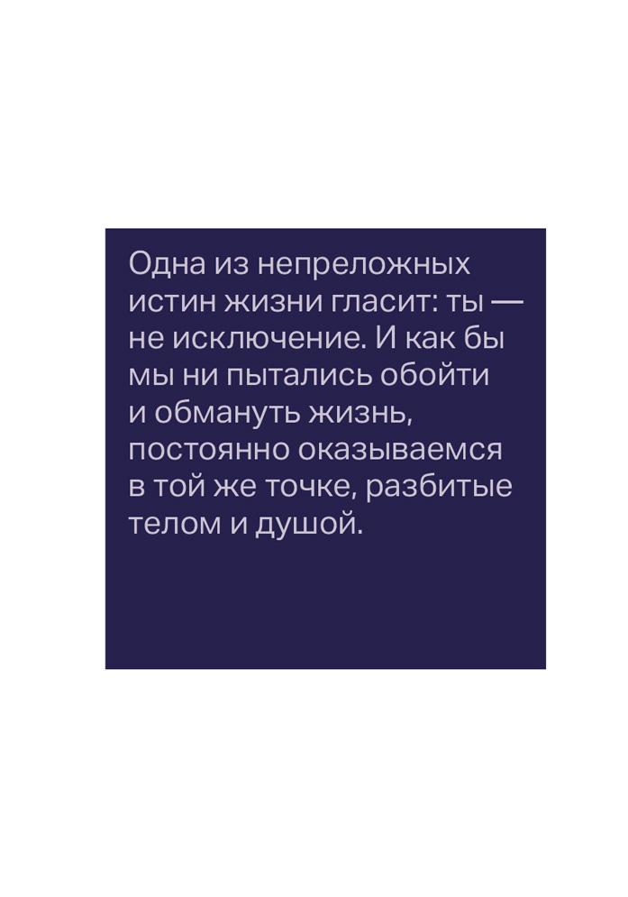При этом одна из непреложных истин жизни гласит: ты — не исключение. И как бы мы ни пытались обойти и обмануть жизнь, постоянно оказываемся в той же точке, разбитые телом и душой. Жизнь не жестока. Просто мы — не исключение из правил. И каждый раз, когда начинаем осмыслять то, что происходит с нами, упираемся в эти самые неотменяемые данности жизни, которые не перепрыгнуть, не обойти и через которые не прорыть подземный ход.