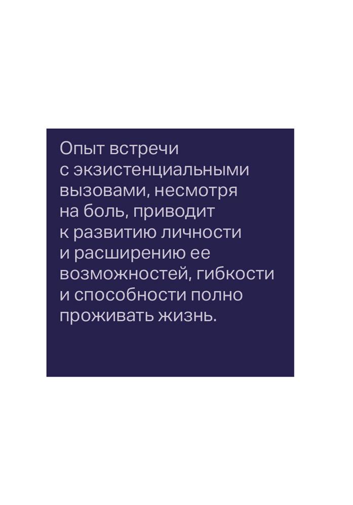 Часто возникает закономерный вопрос: а что плохого в том, чтобы избегать? Какой будет награда за то, что пережил некие мучительные чувства? Проблема с избеганием кроется в том, что каждое успешное уклонение от встречи с экзистенциальными вызовами жизни оплачивается увеличивающимся напряжением в психике, которое на эмоциональном уровне ощущается как возросшая тревога. Это может быть едва заметное нарастание, но, накапливаясь, оно начинает существенно отражаться на психическом и даже физическом уровнях, влияя на качество и полноту жизни.