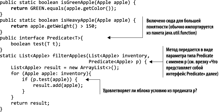 В предыдущем разделе вы видели, что для адаптации к меняющимся требованиям нужен способ более продвинутый, чем добавление множества параметров метода. Отступим на шаг назад и найдем оптимальный уровень абстракции. Одно из возможных решений состоит в моделировании критериев отбора — это работа с объектами-яблоками и возврат boolean в зависимости от каких-либо атрибутов объекта Apple. Например, зеленое ли яблоко? Весит ли яблоко более 150 г? Это называется предикатом, или условием (функцией, возвращающей булево значение). Опишем интерфейс для моделирования критериев отбора: