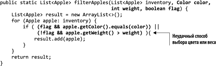 Это исключительно неудачное решение. Во-первых, клиентский код выглядит ужасно. Что означают true и false? Кроме того, это решение плохо адаптируется к смене требований. Что, если фермеру понадобится фильтрация по различным атрибутам яблок, например по размеру, форме, месту происхождения и т. д.? Кроме того, фермеру могут понадобиться более сложные запросы с комбинацией атрибутов, например тяжелые зеленые яблоки. Вам придется написать или несколько дублирующихся методов filter, или один огромный запутанный метод. Пока мы параметризовали метод filterApples значениями типов String, Integer, перечисляемым типом и boolean. Для некоторых четко сформулированных задач этого достаточно. Но в данном случае нам нужен более продвинутый способ передачи методу filterApples критериев выбора яблок. В следующем разделе мы расскажем, как достичь необходимой адаптивности с помощью параметризации поведения.