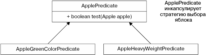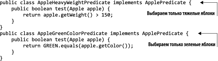 Теперь мы можем объявить несколько реализаций интерфейса ApplePredicate, которые будут соответствовать различным критериям отбора, как показано в следующем фрагменте кода (и проиллюстрировано на рис. 2.1):