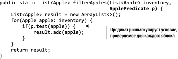 Но как воспользоваться различными реализациями ApplePredicate? Для этого нужно, чтобы метод filterApples принимал на входе объекты ApplePredicate для последующей проверки того, соответствует ли конкретный объект Apple условию. Параметризация поведения — это способность метода принимать в качестве параметров множество вариантов поведения, а затем, опираясь на них, воплощать различные последовательности операций.