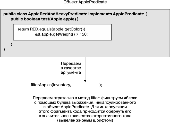 Обратите внимание, что в предыдущем примере важен только код реализации метода test, как показано на рис. 2.2; именно он определяет поведение метода filterApples. К сожалению, в силу того, что метод filterApples может принимать в качестве параметра только объекты, приходится оборачивать данный код в объект ApplePredicate. Это схоже с передачей встраиваемого кода, поскольку мы передаем булево выражение через объект, реализующий метод test. В разделе 2.3 (а более подробно — в главе 3) вы увидите, что благодаря лямбда-выражениям можно непосредственно передать методу filterApples выражение RED.equals(apple.getColor()) && apple.getWeight() > 150 без необходимости описывать несколько классов ApplePredicate. Это повышает лаконичность кода.