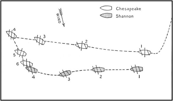 "Chesapeake's" way being deadened, "the ship lay with her stern and quarter exposed to her opponent's broadside. The shot from the 'Shannon's' aftermost guns now took a diagonal direction along