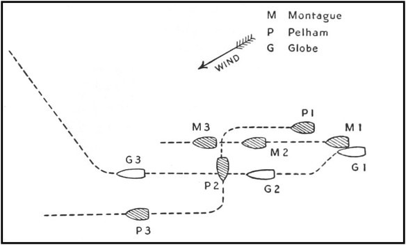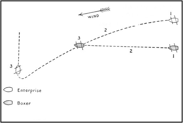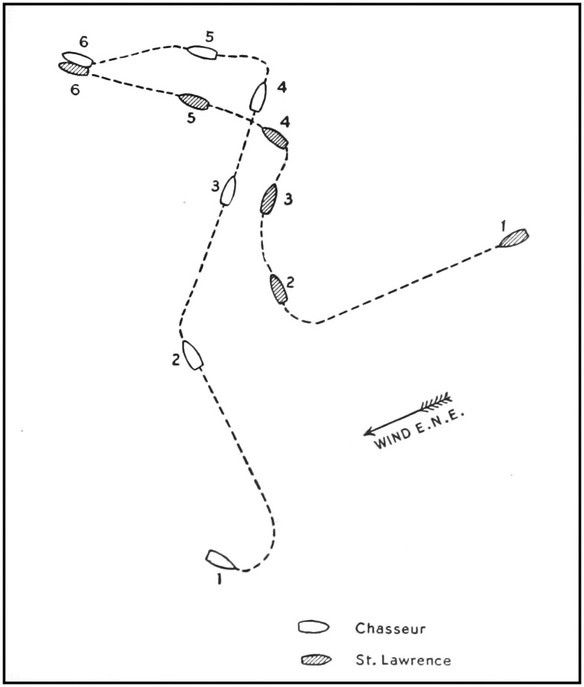 luffed closer to the wind to shake her sails, but in vain; the movement increased her distance, but she still ranged ahead, so that she finally reached much further than abreast of the enemy. To use the nautical expression, she was on the "Shannon's" weather bow (2). While this was happening her sailing master was killed and Lawrence wounded; these being the two officers chiefly concerned in the handling of the ship.