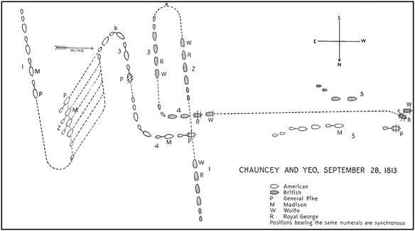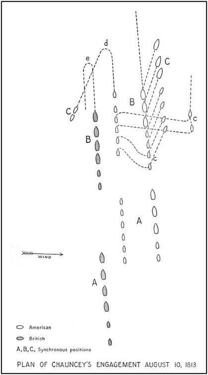 instead of keeping away in obedience to orders, tacked—went about towards the enemy—keeping to windward (d). Chauncey, seeing the risk involved for them, but prepossessed with the idea of luring Yeo down by the appearance of flight set by the schooners, made what can scarcely be considered other than the mistake of keeping away himself, with the heavy ships; "filled the maintopsail, and edged away two points, to lead the enemy down, not only to engage him to more advantage, but to lead him away from the 'Growler' and 'Julia'" (C). Yeo, equally dominated by a preconceived purpose not to bring his ships under the guns of the "Pike," acted much as a squirrel would do with two nuts in sight; he went for the one safely distant from suspected danger. "He kept his wind," reported Chauncey, "until he had completely separated those two vessels from the rest of the squadron, exchanged a few shot with the 'Pike,' as he passed, without injury to us, and made sail after the two schooners" (e). Some time after midnight these surrendered to odds plainly irresistible.