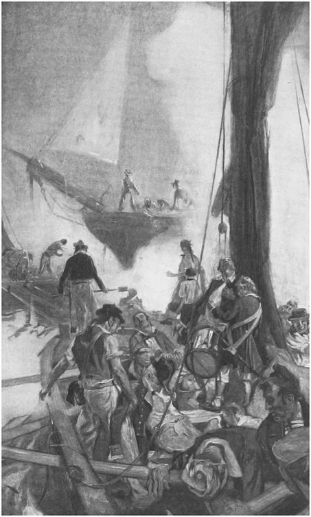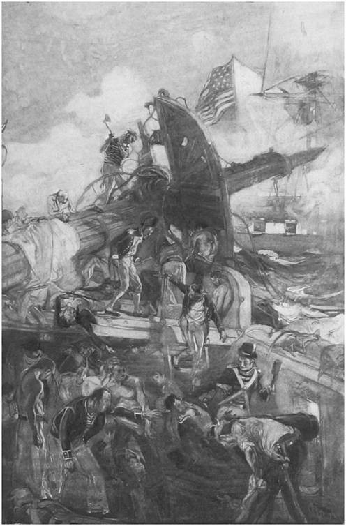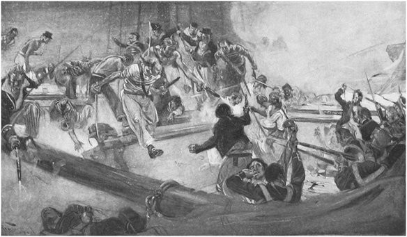 musket-ball through his body; but he had already given orders to have the boarders called, seeing that the ship must drift foul of the enemy (5). The chaplain, who in the boarding behaved courageously, meeting Broke in person with a pistol-shot, and receiving a cutlass wound in return, was standing close by the captain at this instant. He afterwards testified that as Lawrence cried "Boarders away", the crews of the carronades ran forward; which corresponds to Broke's report that, seeing the enemy flinching from their guns, he then gave the order for boarding. This may have been, indeed, merely the instinctive impulse which drives disorganized men to seek escape from a fire which they cannot return; but if Cooper is correct in saying that it was the practice of that day to keep the boarders' weapons, not by their side, but on the quarter-deck or at the masts, it may also have been that this division, which had so far stuck to its guns while being raked, now, at the captain's call, ran from them to get the side-arms. At the Court of Inquiry it was in evidence that these men were unarmed; and one of them, a petty officer, stated that he had defended himself with the monkey tail of his gun. Whatever the cause, although there was fighting to prevent the "Chesapeake" from being lashed to the "Shannon", no combined resistance was offered abaft the mainmast. There the marines made a stand, but were overpowered and driven forward. The negro bugler of the ship, who should have echoed Lawrence's summons, was too frightened to sound a note, and the voices of the aids, who shouted the message to the gun deck, were imperfectly heard; but, above all, leaders were wanting. There was not on the upper deck an officer above the grade of midshipman; captain, first lieutenant, master, marine officer, and even the boatswain, had been mortally wounded before the ships touched. The second lieutenant was in charge of the first gun division, at the far end of the deck below, as yet ignorant how the