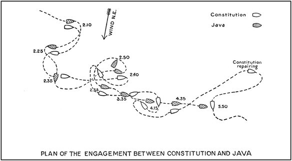 guns, answering to the thrusts and blows of individual encounter. In this game of manœuvres the "Constitution" was somewhat handicapped by her wheel being shot away at 2.30. The rudder remained unharmed; but working a ship by relieving tackles, the substitute for the wheel, is for several reasons neither as quick nor as accurate.