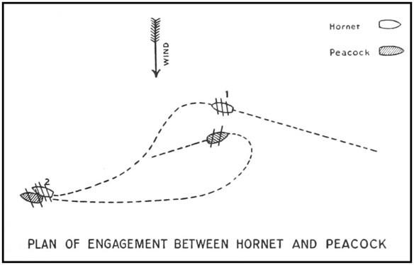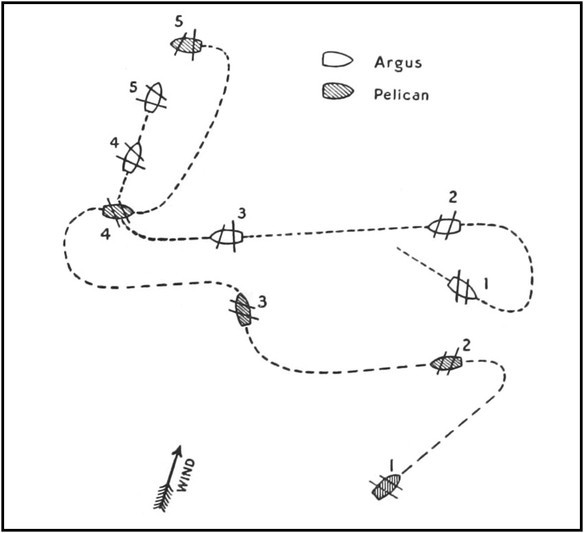 end his life. He at first refused to be taken below, but loss of blood soon so reduced him that he could no longer exercise command. Ten minutes later the first lieutenant was stunned by the graze of a grapeshot along his head, and the charge of the ship devolved on the second. By this time the rigging of the "Argus" had been a good deal cut, and the "Pelican" bore up (3) to pass under her stern; but the American brig, luffing close to the wind and backing her maintopsail (3), balked the attempt, throwing herself across the enemy's path, and giving a raking broadside, the poor aim of which seems to have lost her the effect that should have resulted from this ready and neat manœuvre. The main braces of the "Argus" had already been shot away, as well as much of the other gear upon which the after sails depended; and at 6.18 the preventer (duplicate) braces, which formed part of the preparation for battle, were also severed. The vessel thus became unmanageable, falling off before the wind (4), and the "Pelican" was enabled to work round her at will. This she did, placing herself first under the stern (4), and then on the bow (5) of her antagonist, where the only reply to her broadside was with musketry.