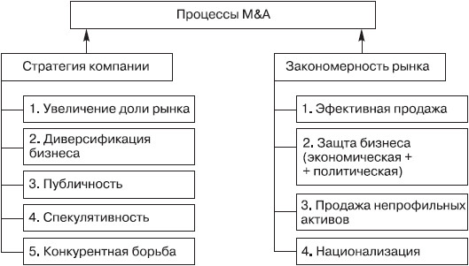 С другой стороны, необходимость развития компании посредством М&А заключается в том, что возникает ситуация, обусловленная различными факторами, при которой развитие компании только на базе имеющихся у нее активов (производственных мощностей, ресурсной базы и т. п.) уже невозможно. Для перехода компании на качественно новый уровень развития ей необходим значительный толчок, в результате чего и возникают предпосылки для использования стратегии М&А.