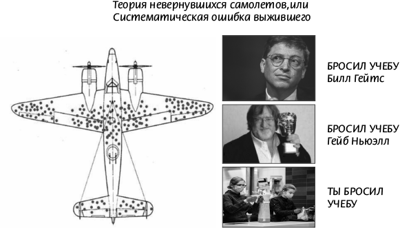 Ошибка выжившего — распространенное когнитивное искажение, в основе которого лежит непонимание причины и следствия. Человек находит закономерность в наборе данных, но не учитывает вероятность простого совпадения. Например, то, что некоторые основатели известных компаний бросили учебу в университете и стали успешными, является совпадением, поскольку не обязательно этот факт привел их к такому результату (рис. 2).