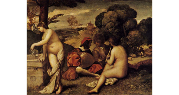 На картине «Сельский концерт» Джорджоне мы видим обнаженные женские фигуры и одетые мужские. Это такой пикник. Группа сидит на холме и у них в руках музыкальные инструменты. Посмотрите, как написаны женщины — словно плоды. Надо сказать, что флорентийские художники писали женщин длинными, худыми, истеричными и напряженными, хотя флорентийки всегда были такими толстушками. И на данной картине женщины похожи на таких позднеантичных Венер.