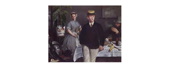 Посмотрите, как он одет, какие белые брюки, рубашка. Галстук. Такой щеголь для модного журнала «Сноб». Продукт того времени. Обратите внимание на стол. Он стоит перед очень хорошо убранным столом. Какая-то служанка, эпоха расцвета ресторанной жизни во Франции и натюрморт написан так, как его писали малые голландцы. Эта картина написана им в духе не условного академизма, а классической натурности мастеров, но изображающая новую жизнь и героев. И Мане один, кто работает в данной манере. Других художников, в которых сочетались бы полнота картины и классическая традиция — нет. Именно ему принадлежит очень интересное, одно социальное открытие: больше никто так полно не описывал для нас жизнь своей среды.