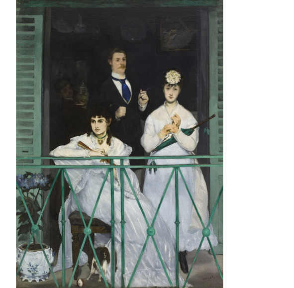 Прежде, чем мы пойдем дальше я хочу показать знаменитый «Балкон». На нем стоит его старший брат, здесь же женщина, чей портрет есть отдельно. Она очень талантливая художница того времени и родственница Мане, по имени Берта Моризо.