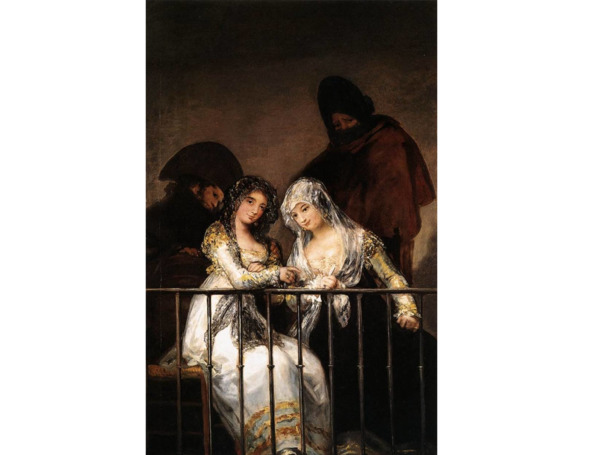 Если внимательно присмотреться к этой картине, то она повторяет сюжет Гойи «Махи на балконе». Буквально. Так же сидят дамы и стоит третья фигура.