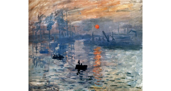 И не важно ее ли это зонтик или платье, или нет, а важен только солнечный свет, создающий уникальный эффект. Мадам Моне по земле идет? Мир теряет массу. Благодаря тому, что он попадает пылинкой происходит вот это космическое чудо. Это совершенно удивительно. Он больше никогда не будет терпеть массы, как в живописи импрессионистов. Он становится физически лишенным фактуры и веса. Вот эта картина была выставлена в 74 году в мастерской фотографа Надара на бульваре Капуцинов. И называлась она «Восход солнца». Было еще одно слово «Восход солнца и впечатление». Пожалуй, точнее не назовешь. Это тема впечатления. Художник изобразил впечатление от восхода солнца. Эту мгновенность, не длительность состояния. Остановись, мгновение, ты прекрасно! А как мгновение можно запечатлеть? Этюдным способом. И в этой картине Клода Моне есть очень интересная особенность — очень искажен свет.