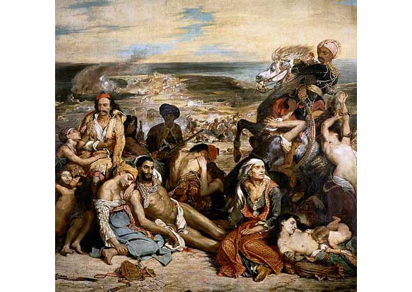Однажды, произошел такой случай. Делакруа — властитель дум, а они все были социально заряжены, написал «Резня на Хиосе». Так как они все были передовые, то сочувствовали грекам, сражавшимся против турков. И вот он пишет, как турки истребляют греков. Общество должно отзываться и оно отозвалось. Приходит поэт Бодлер и говорит: