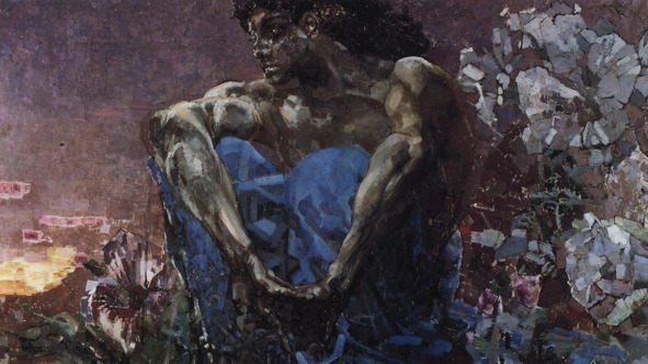 Посмотрите на пальцы — они кажутся обнаженными нервами. Вся картина написана абсолютно на предельном напряжении истощенной нервной системы, на последнем напряжении истощения. Истоки этой стилистики входят не в Античность, как у всех а в витражную готику. Он пользуется черным фоном и цвет кладет так, чтобы он смотрелся как витражный свет. Этот витражный алый, витражный белый, витражный алый другой, необыкновенно написанный. И вся картина, и каждая из фигур находится в состоянии фантастического перенапряжения. Если вы посмотрите чему равны объемы этих фигур, то увидите, что они хрупки до невозможности. Какой хрупкой написана Мария и Иоанн — это знак их тленности и их ломкости, такого невероятного страдания. Они истощены. Иоанн поддерживающий Богородицу. Это алое и белое, сведенные глаза, ее маленькое личико, только одни щеки. Пальцы. Опять пальцы поставлены так, как будто это вопиют обнаженные нервы. Кровь струится из каждой поры. Каждая мышца подчеркнуто втянута и изучена, истерзана, вопиющая от страдания человеческая плоть.