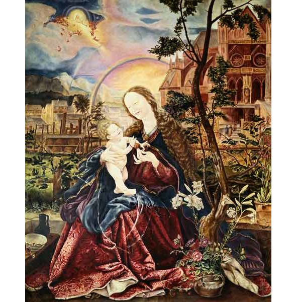 Какая замечательная, просто удивительная часть изумительного алтаря. Это шедевр, которым надо заканчивать. Фрау, которая ни к чему не была готова. А ребенок растет, она его из себя вынула, искупала, вот тут даже горшок детский — все атрибуты на месте. И она его поддерживает на руках. Она пальцами тонкими поддерживает и как она смотрит на него неотрывно, какие ее переполняют чувства, какое ликование идет. Ликование небес. Небеса-то как ликуют, просто свет открылся и там льется божественный свет: неестественный, необычный, литургический. И ангелы играют, но как они играют, выводя мелодию торжества. Какое у него личико. И тут какой-то элемент такой — готика на готике. И это все изображение чуда, изображение великого события. Чудо мира, света и цвета. Такого ликования души, что никакой музыкой не перебить. Как бы она не играла, как бы свет не сиял — невозможно выразить, потому что это запредельно. Потому что Грюневальд — основоположник особого стиля, основоположник мирового живописного немецкого экспрессионизма. И все, что идет вслед за этим словом имеет отношение к максимальной формулировке. Он был великим немцем, величайшим человеком своей эпохи и самым большим немцем из всех немцев. Он создал путь немецкой изобразительной культуры. До 15-го века она была Средневековой, но с особым привкусом: графическо-ювелирным. А здесь мастерство и гениальность.