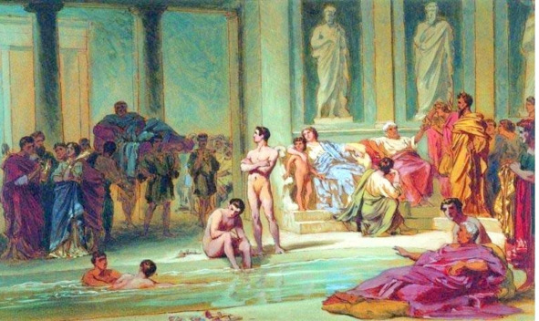 Что такое вода? 865 общественных бань. Кроме этих бань у них было 11 терм, по одной в каждом округе. А это посерьезнее бань. Чтобы построить баню нужно было иметь деньги, прийти в Сенат, доложить им, как эти деньги были заработаны. Если честно, то построив баню, ты становился героем. На фронтоне бани писалось твое имя. Наши Сандуны — это жалкое подобие Римских бань. Женщины строили бани. К примеру, бани Сабины. Туда и женщины ходили. А термы строили только Императоры — это было только их занятие.