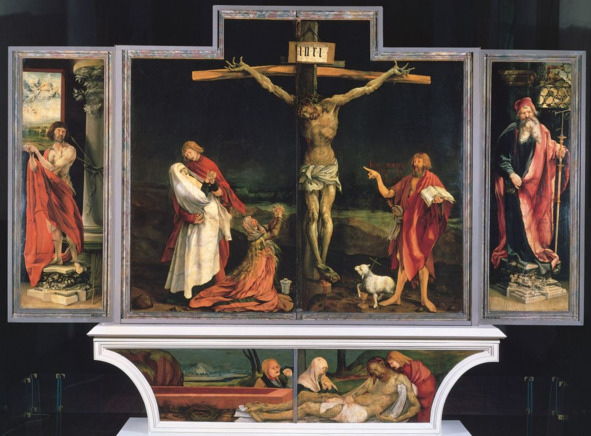 Грюневальда подделывали, делали копии. Он был художником не похожим ни на кого вообще. Ни на одного из своих современников. Ни на одного из своих последователей. Он написал несколько распятий. В том числе распятие в «Изенгеймском алтаре». Совершенно уникальное, сколоченное из простых деревянных бревен, еле отструганных. К ним прибита доска и вы видите прибитое тело.