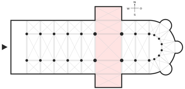 Но я хочу остановиться на этой части собора. Она очень важная и называется трансепт, то есть трансцендентная часть — это место метафизической встречи человека и Бога. И середина трансепта есть пуповина. Когда вы смотрите на собор снаружи, то видите над собором шпиль или купол. Его всегда возводят над пуповиной трансепта. Таким образом, трансепт — это место не человека. Трансепт — это душа.