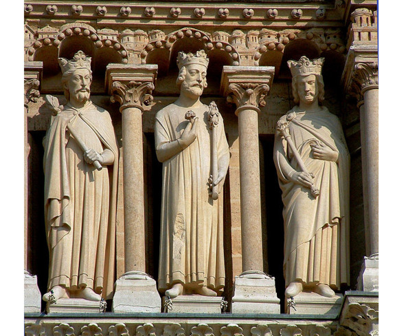 Первая часть — нижняя, что соответствует кораблю — портал. Собор представляет собой классический образец латинской классической архитектуры, который называется «портальная архитектура». Первый этаж представляет собой порталы, которые обязательно соответствуют кораблю. А в этом месте находится галерея кораблей. Всегда над порталом, здесь или в другом месте, в готическом соборе должна быть галерея кораблей. Обязательно! Это история. Когда вы стоите перед собором, то на вас смотрят короли. На вас смотрит история. Александр Македонский, единственный из язычников, кто был принят и восточной, и западной христианской церковью. За то, чтобы фигура того или иного лица находилась в галерее идут целые «войны». Из-за Наполеона были такие склоки! А в галереях есть короли или папы, которых никто уже и не помнит. Де Голь должен был быть там — его сначала поставили, а потом сняли. А вы можете их разглядеть? Никогда! Никто бы и не узнал, что в галереи стоит та или другая историческая личность, если бы нам об этом не сказали. Вот и стоят они каждый в своей нише. В своем историческом футляре и смотрят на нас. Они ничего друг о друге не знают, их разделяют века и между этими скульптурами крайне редко происходит общение. Они все, как правило, стоят одиноко.