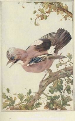 the daw mentally of all our crows, and as he excels most of our wild birds in beauty he would naturally have been a first favourite as a pet but for the fact that it is only in a state of nature in which he is like the daw--lively, clever, impish; in captivity he is more like the magpie and affiliates even less than that bird with his human associates. In confinement he is a quiet, almost sedate, certainly a silent bird: He is essentially a woodland species; all his graces, his various, often musical, language, with many imitations of bird and animal sounds, and his spectacular games and pretty wing displays, are for his own people exclusively. He must have his liberty in the woods and a company of his fellow-jays to exhibit his full lustre.