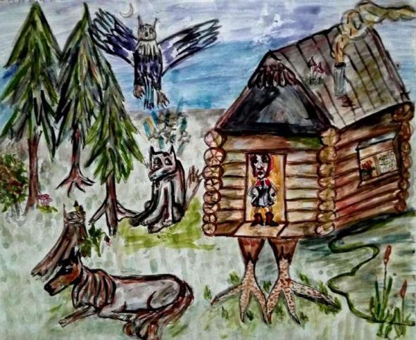 Привязал коня близко к жилищу и вдруг животное заржало и затопало копытами, норовясь вырваться и убежать. Огромный волк медленно крался, оскалив клыкастую пасть и лязгая зубами. Приближался со стороны избушки, норовясь наброситься на коня. Глаза его горели зелёным огнём. И тут избушка своей куриной лапой так ударила волка, что тот высоко отлетел и, шмякнувшись об землю, жалобно заскулил и убежал прочь.
