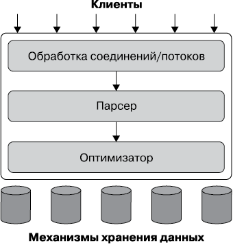 На самом верхнем уровне — уровне клиентов — располагаются службы, не являющиеся уникальными для MySQL. Это службы, в которых нуждается большинство сетевых клиент-серверных инструментов или серверов: обработка соединений, аутентификация, безопасность и т.д.