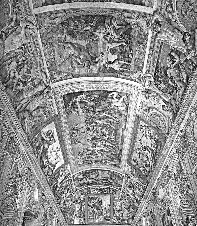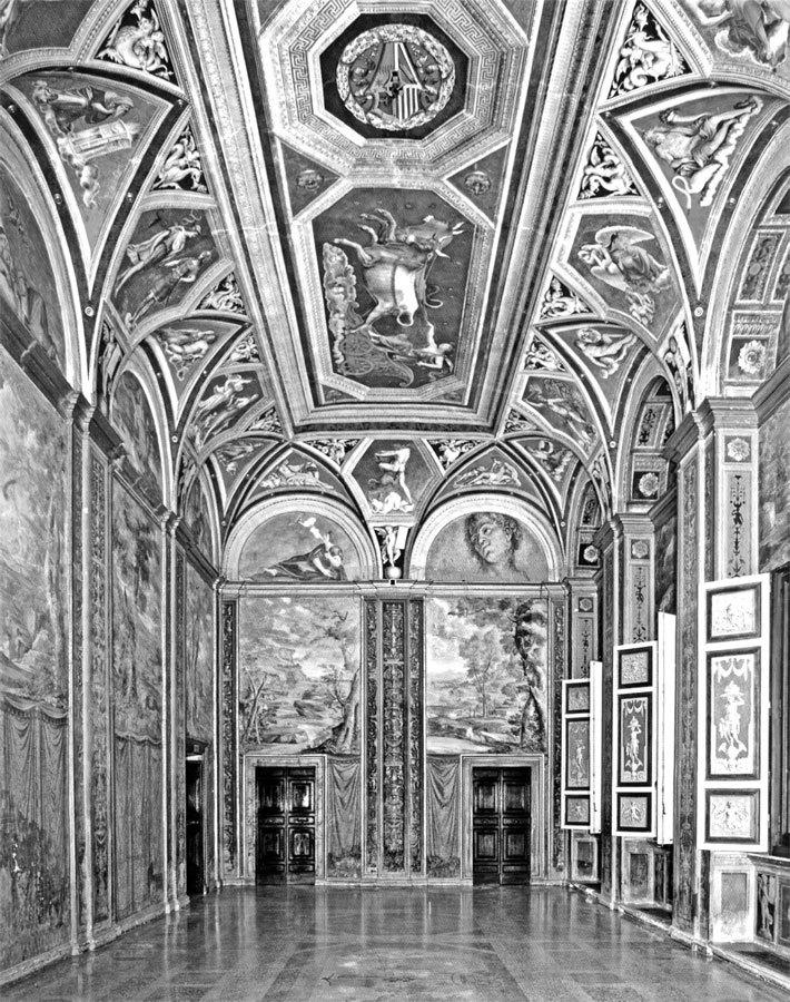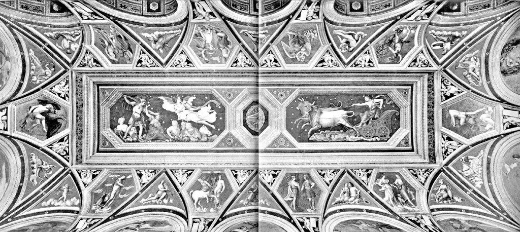 Считается, что росписи виллы Фарнезина впервые появились в 1506–1511 годах. К 1511 году работа над ними была якобы полностью закончена [1238:2], с. 8. Однако В СЕРЕДИНЕ XVII ВЕКА ЗАЛ ГАЛАТЕИ ВНОВЬ РАСПИСЫВАЕТСЯ. Якобы были добавлены лишь некоторые новые картины. Но так ли это? Зачем добавлять новые картины к полностью готовой и уже более 100 лет существующей росписи?