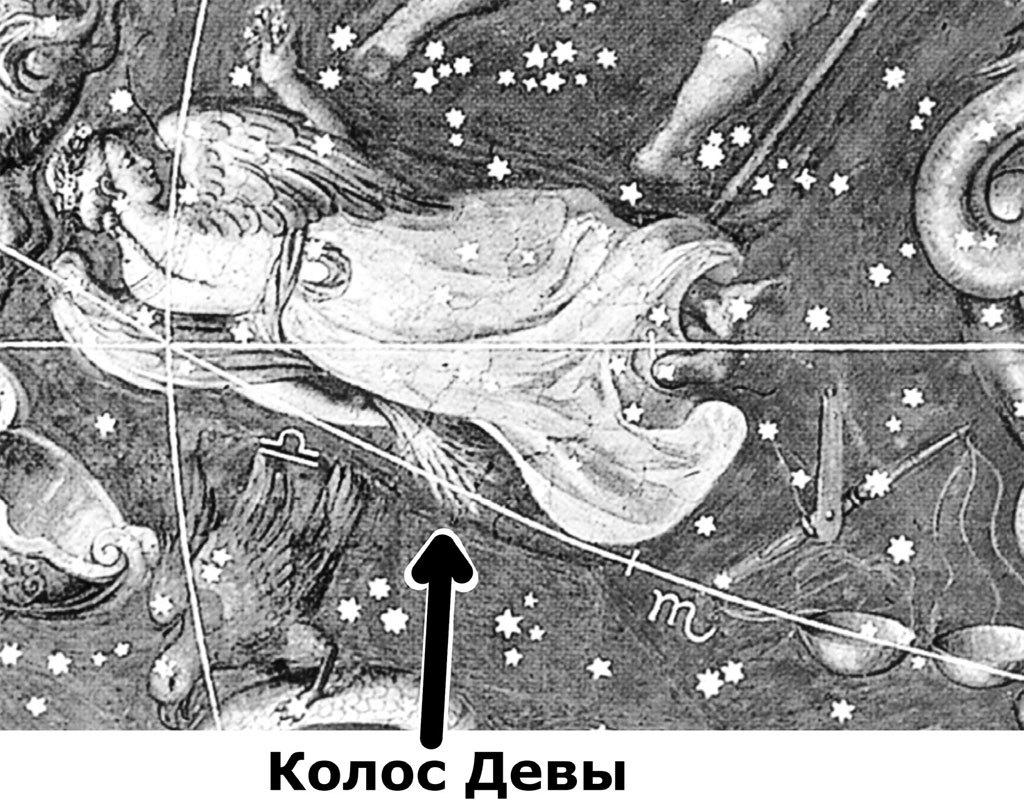 Перейдем к Сатурну. Он легко узнается на фреске, которую мы обозначили номером 9 на рис. 10. Крупно эта фреска представлена на рис. 26. Сатурн показан в виде седобородого старца в короне с серпом в руке. Серп или коса – отличительный признак Сатурна на старинных зодиаках [НХЕ]. В другой руке Сатурн держит пучок колосьев, которые он срезал своим серпом. Это тоже чисто астрономическая символика: пучок колосьев в старинной астрономии обозначал яркую и очень знаменитую звезду «Колос Девы». Другие ее названия – Спика, альфа Девы. Это – самая яркая звезда зодиакального созвездия Девы и одна из самых ярких звезд небосвода. На старых звездных картах звезда Колос Девы изображалась в виде колоса или пучка колосьев, см., например, рис. 27, рис. 28, рис. 29.