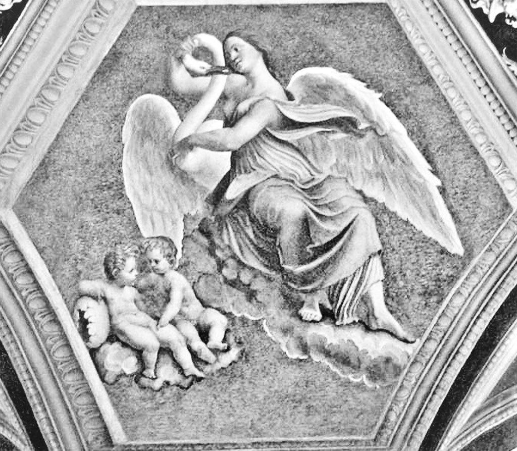 Все остальные картины на потолке зала Галатеи, как мы обнаружили, не несут в себе астрономических данных, относящихся к дате зодиака. Тем не менее, иногда они все же содержат некоторые пояснения к зодиаку, см. ниже. Заметим, что все эти дополнительные картины заключены в рамки другого вида, чем зодиакальные картины – а именно, треугольники, полукруги, а также один правильный восьмиугольник с гербом в самом центре потолка (в то время, как зодиак, напомним, изображен в шестиугольных рамках). В качестве примера приведем два фрагмента потолка зала Галатеи, заключенных в треугольные рамки и не имеющих отношения к гороскопу зодиака VG, см. рис. 11, рис. 12.