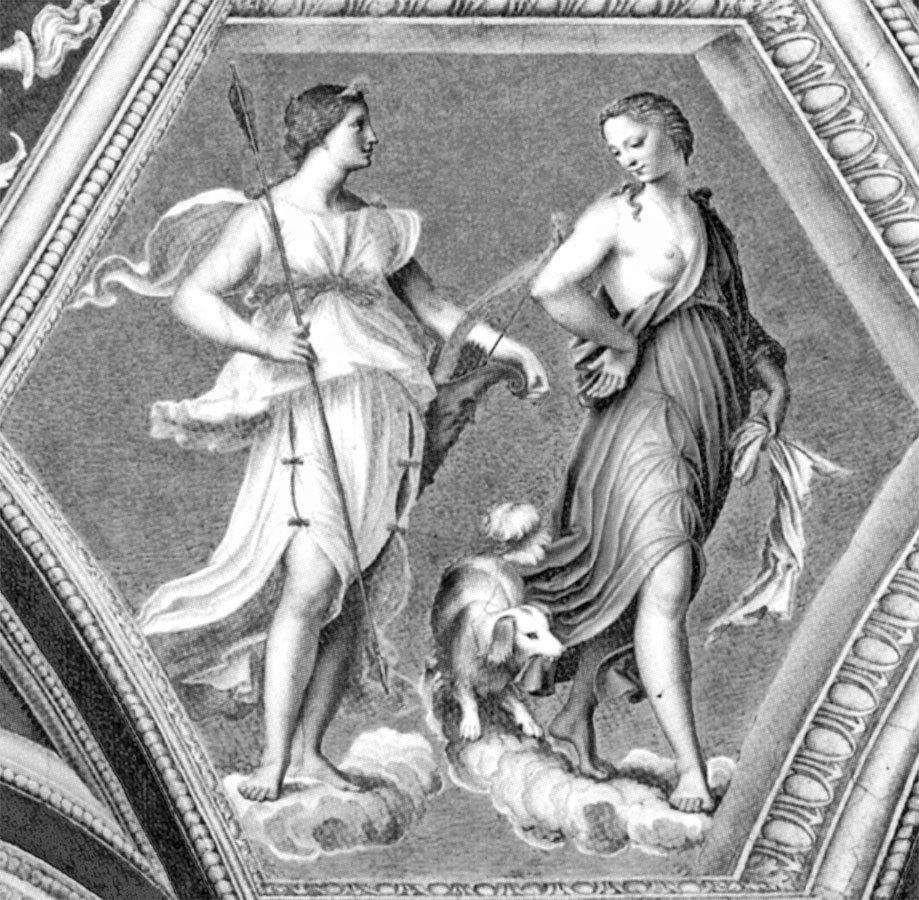 Остановимся на этой фреске подробнее. Изображены две женщины, стоящие на облаках, рис. 31. Слева стоит богиня-охотница Артемида. В одной руке у нее ДРОТИК, другой она опирается на колчан с луком. Рядом с ней, на соседнем облаке, стоит молодая женщина в откровенно приспущенной тунике, обнажающей одну грудь. ОХОТНИЧЬЯ СОБАКА Артемиды стоит рядом с ней и хватает красавицу за подол платья.