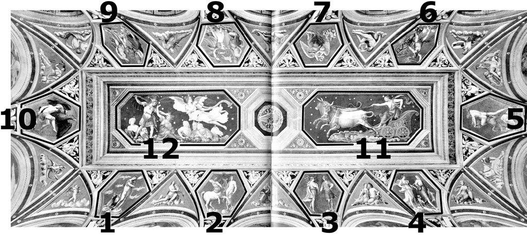 Рис. 10. Потолок зала Галатеи в вилле Фарнезина с обведенными и пронумерованными 12-ю картинами, составляющими зодиак VG. Рисунок сделан на основе фотографии из [1238:2], с. 58–59.