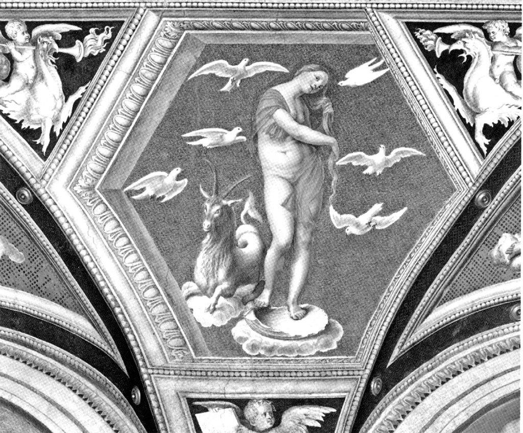 Слева от картины «Венера в Козероге» показан стреляющий купидон – обычный спутник Венеры, рис. 15. А ниже, на стене помещена большая картина Рафаэля, изображающая Венеру, стоящую в раковине-повозке, которую влекут по морю два дельфина. Вокруг летают купидоны, стреляющие из лука, рис. 15.