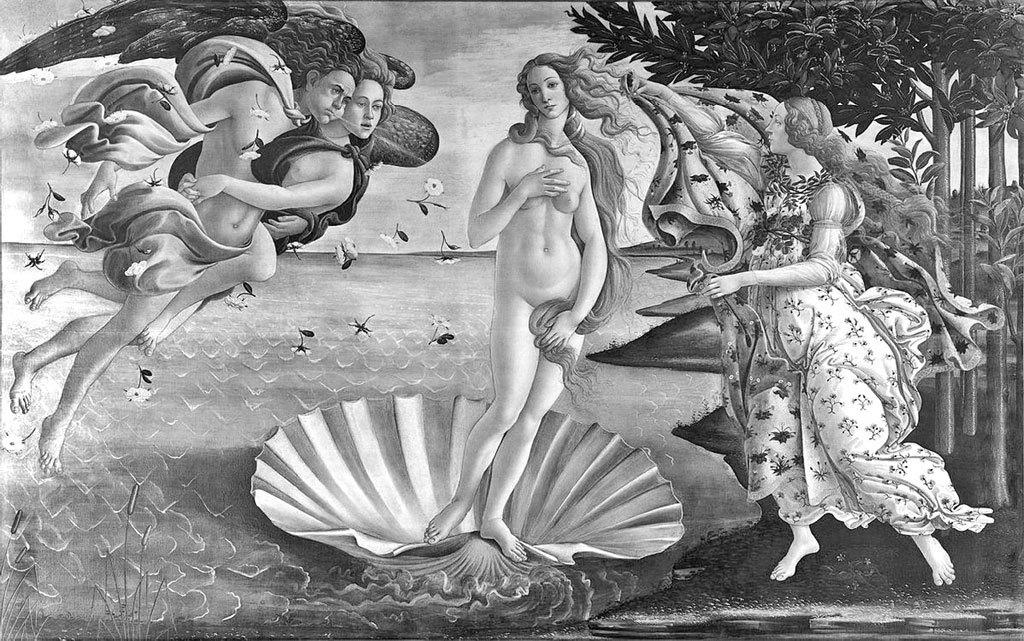 Рис. 14. «Рождение Венеры». Венера с золотистыми волосами стоит на раковине. Картина художника эпохи Возрождения Сандро Ботичелли. Взято из Википедии, «Рождение Венеры (Картины Ботичелли)» ru.wikipedia.org.