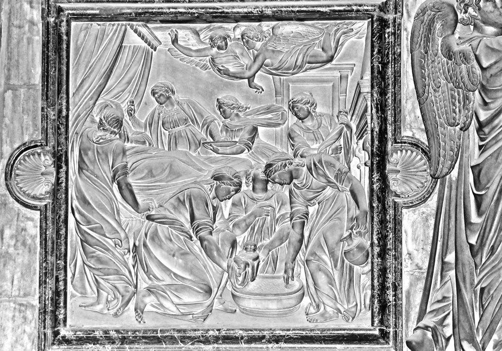 Рис. 16. Рождество Богородицы. Первый из трех барельефов, посвященных жизни Богородицы. По бокам барельефа – МОРСКИЕ РАКОВИНЫ, символы Богородицы. Миланский собор, Италия. Фотография 2014 года.