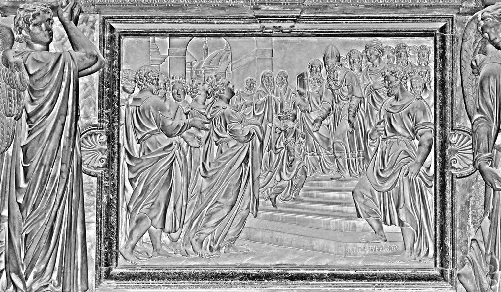 Рис. 17. Введение в церковь Пресвятой Богородицы. Второй из трех барельефов, посвященных жизни Богородицы. И здесь по бокам барельефа – МОРСКИЕ РАКОВИНЫ, символы Богородицы. Миланский собор, Италия. Фотография 2014 года.