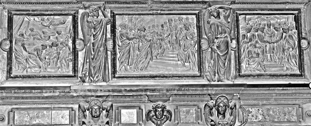 Рис. 19. Три важных события в жизни Богородицы – Рождество, Введение в церковь и обручение с Иосифом. Серия из трех барельефов на стене Миланского собора. Милан, Италия. Фотография 2014 года.