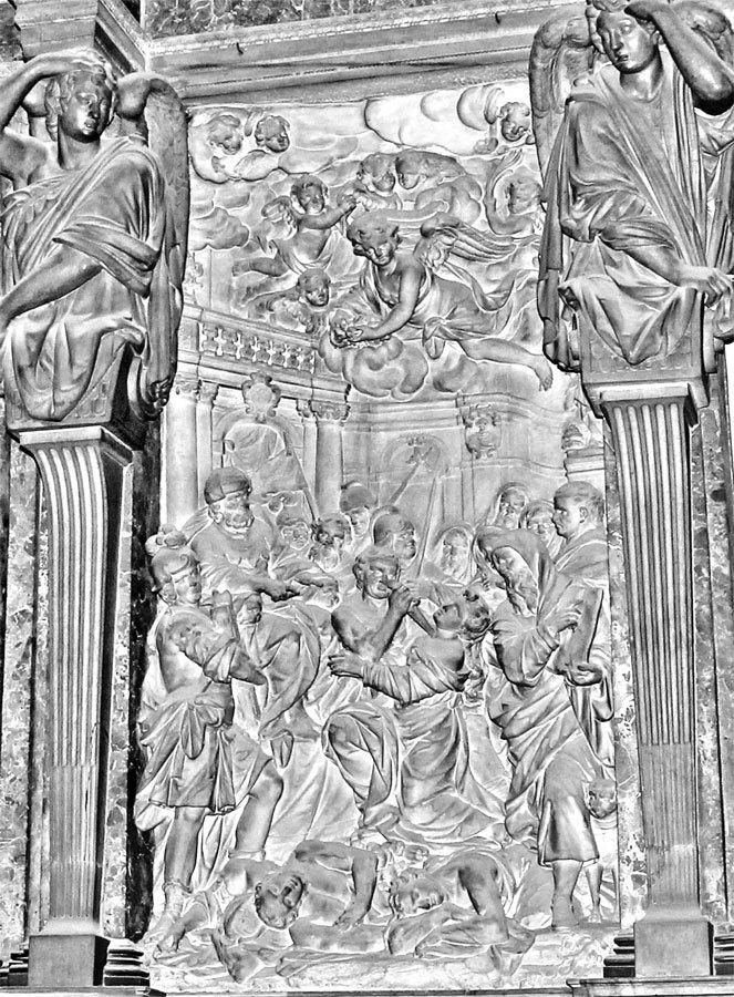 Рис. 21. Еще один барельеф на внутренних стенах Миланского собора. Показано преследование христианских мучеников. Поскольку это событие напрямую не связано с Богородицей, символика Богородицы здесь отсутствует – морские раковины не изображены. Фотография 2014 года.