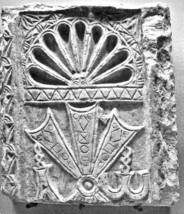 Рис. 22. Старинная христианская каменная плита с резбой. Морская раковина как часть христианской символики. Под раковиной изображен крест (сохранилась только его верхняя часть) и буквы Альфа и Омега. Музей Кордовской Мечети, Кордова, Испания. Фотография 2013 года.