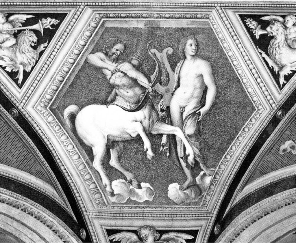 На рис. 23 представлена еще одна фреска на потолке зала Галатеи, обозначенная номером 2 на рис. 10. Изображено созвездие Стрельца в облаках. Рядом стоит бог Аполлон – символ Солнца. Облака подчеркивают, что речь идет о звездном небе.