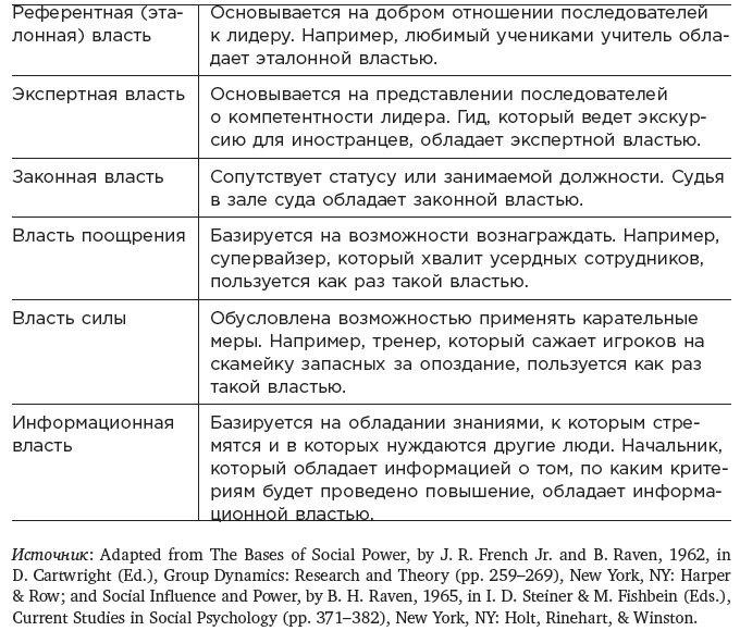 В современной вузовской программе труды Френча и Рэйвена (1959) – наиболее популярные работы по исследованию власти. В своей монографии они рассмотрели власть в условиях взаимозависимых отношений между тем, кто оказывает влияние, и теми, на кого это влияние направлено. Вместе Френч и Рэйвен выделили пять общих и важных форм власти: эталонная (референтная); экспертная; законная; власть, основанная на вознаграждении или же на принуждении. Рэйвен (1965) описал еще и шестую – информационную власть (таблица 1.1). Каждая из этих форм увеличивает способность лидера влиять на отношения, ценности или поведение последователей.